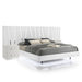 The Europa Panel Wall Bed offers a blend of modern elegance and practical design. This set includes a panel bed, two nightstands, and two nightstand back panels. The sleek, integrated headboard wall and nightstands creates a seamless and sophisticated look, enhanced by the white finish, mylar accents, and acrylic drawer pulls. Built with quality craftsmanship, the eco-friendly manufactured woods ensure durability, while the surfaces are finished with a glossy white topcoat and padded upholstery for added comfort. The bed features upscale extras like soft blue base lighting that reflects off the silver mylar bases, casting an ambient glow. The sturdy drawers, constructed with dovetail joinery and ball bearing glides, provide durable, easy-glide storage with snag-free interiors. The 2-drawer nightstands offer ample storage for bedside essentials. Choose the Europa Panel Wall Bed for a luxurious and contemporary addition to your bedroom.
