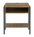Beautiful to behold, this urban contemporary end table is loaded with high style and convenience. The wood sports a light, natural-looking finish that provides a dramatic contrast to the black metal frame. Its open cubby is perfect for stowing away books and magazines. A cleverly placed AC/USB charging port on the top lets you power up without moving a muscle.
