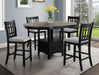 Discover practicality and style with our dining group. With a straightforward design, this set is perfect for everyday meals and casual gatherings. The grid-back chairs offer supportive seating, while the cushioned seats ensure comfort. With its under-table shelf, the table provides a handy spot for dining essentials.