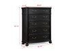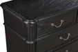 Indulge in the timeless elegance of this exquisite bedroom collection, a true embodiment of classic sophistication. Each piece is masterfully constructed with a striking charcoal finish that commands attention while accentuating the intricate detailing and flowing lines. The magnificent bed, with its bold headboard, has an optional pediment and is upholstered to create a stunning contrast that promises opulent comfort. Complementing the bed are the sleek nightstands and capacious dresser, each graced with antique finish hardware against the matte background.