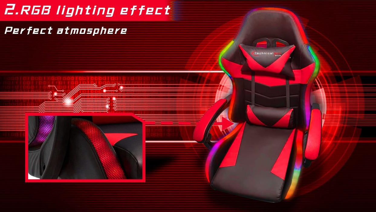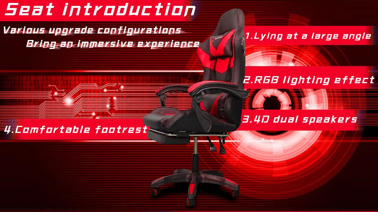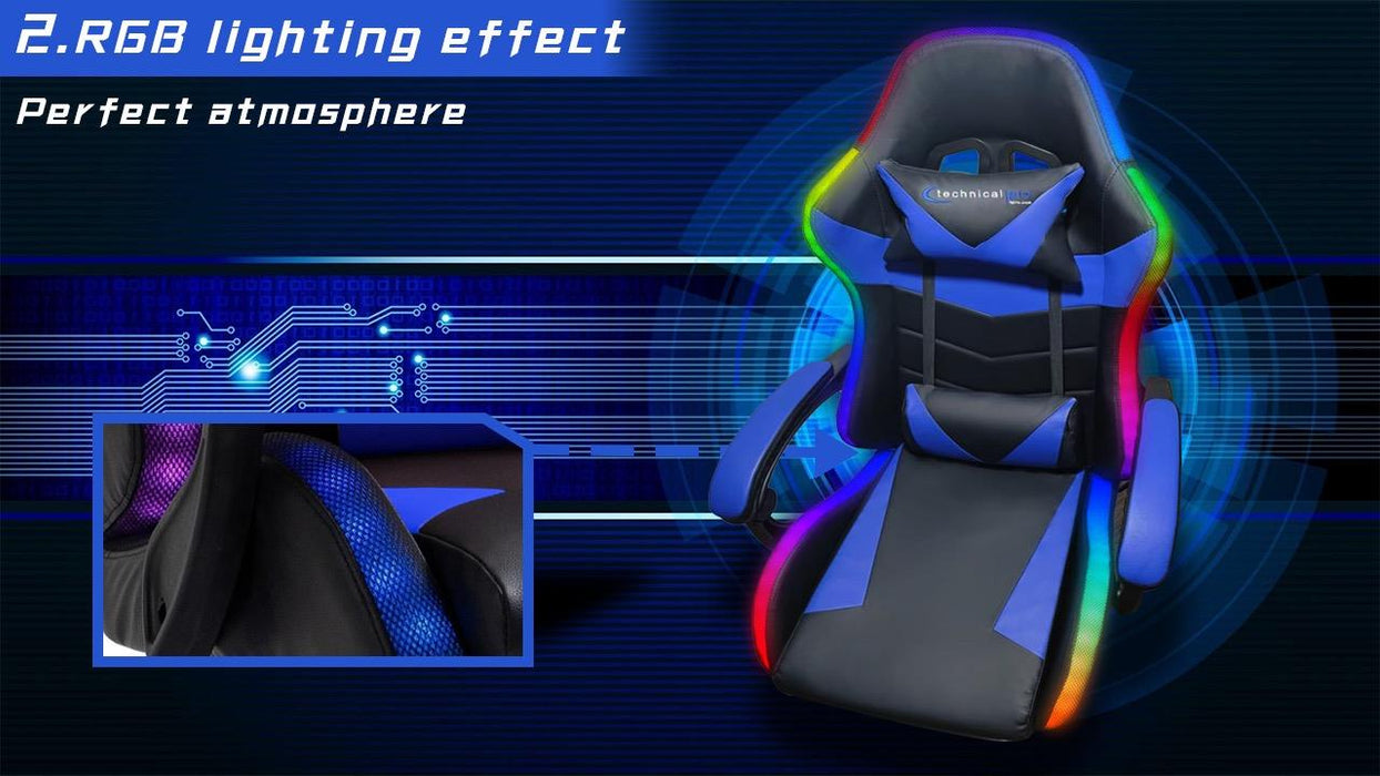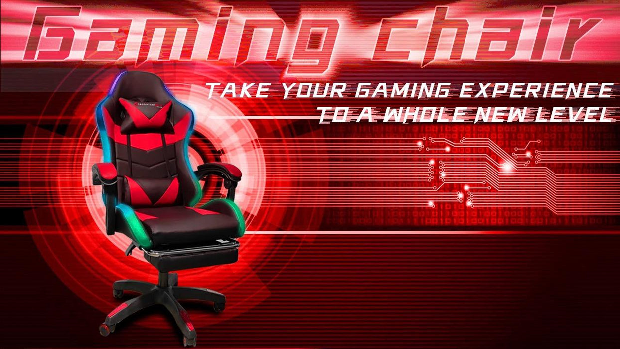Enjoy your gaming experience with this LED Gaming Chair. It features vibrant RGB LED lighting that can be customized with remote, plus built-in Bluetooth speakers and a leg rest. Experience ultimate comfort while you play!