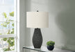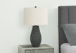 - Contemporary Design: 24" high table lamp with a black resin base featuring a raised, dotted textured finish and an ivory fabric drum shade.
