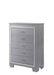 This bedroom collection offers a touch of glamour and luxury to any home. The chic silver finish paired with elegant textured panels creates a sophisticated look that can elevate any bedroom decor. The bed is a statement piece, featuring a stunning tufted headboard with integrated LED lighting that adds a classic touch to the modern design. Accompanying the bed is a selection of matching furniture pieces, including a dresser with a mirror, a tall chest, and nightstands, all finished in the same lustrous silver tone.