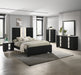 This bedroom set encapsulates modern minimalism, rendered in a soothing, natural wood finish that brings an organic, airy feel to any bedroom. The clean-lined bed boasts a broad headboard that stands as a subtle statement piece with integrated lighting. A streamlined dresser and tall chest offer ample storage, their clean facades interrupted only by the slender, discreet drawer pulls that underscore the set's sleek aesthetic. A matching nightstand completes the set, providing the perfect perch for a lamp and nightly reads.