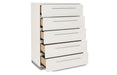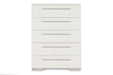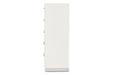 Enhance your bedroom with the Sapphire Modern 5-Drawer Chest in high gloss white. Crafted from high-quality manufactured wood, this chest features a flawlessly smooth, ripple-free surface and a glossy white laminate finish for a sleek, contemporary look. The design is accented by elongated chrome drawer pulls and silver mylar bases that catch and reflect light, creating a striking modern effect. Inside, the roomy drawers offer ample storage with durable dovetail joinery and smooth full-extension slides for effortless use. Combining stylish design with practical functionality, this chest is perfect for adding a touch of sophistication to your space.