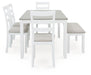 - Includes dining table, bench and 4 chairs