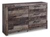 Modern yet hefty. This dresser makes an urban eclectic statement. Seasoned raw wood look merges with the clean lined design we love today. Muted rustic finish over replicated pine grain maintains its authenticity. Roomy drawers are flanked with attractive framed front and pilasters. Handles with antiqued gunmetal finish complete this beauteous look with easy to pull function.