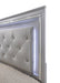 This bedroom collection offers a touch of glamour and luxury to any home. The chic silver finish paired with elegant textured panels creates a sophisticated look that can elevate any bedroom decor. The bed is a statement piece, featuring a stunning tufted headboard with integrated LED lighting that adds a classic touch to the modern design. Accompanying the bed is a selection of matching furniture pieces, including a dresser with a mirror, a tall chest, and nightstands, all finished in the same lustrous silver tone.