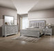 This elegant bedroom suite combines timeless design with contemporary appeal. The soft gray finish offers a modern twist on classic styling, with integrated LED lighting on the tufted headboard adding a luxurious focal point. The collection includes a bed, nightstands, a dresser, and a mirror, all featuring refined detailing and silver-toned hardware that exudes sophistication. Each piece showcases a distinct wood grain pattern, enhancing the suite's upscale charm. The dresser and nightstand provide generous storage, with smooth-gliding drawers that cater to a seamless organization.