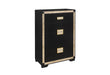 The Blake collection combines style and elegance with many beautiful features. The collection is outlined with gold colored crushed crystal to highlight its unique design. The Bed has a tall headboard and two lights along with quilted padding. The lights add style, design and function which can be used as reading lights. The quilted padding complements the design and adds comfort. All the other pieces have the black finish and crushed gold crystal outline complemented by the black and gold hardware.