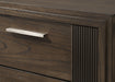 Create a warm and inviting retreat with this beautifully crafted bedroom ensemble, where timeless design meets modern functionality. Featuring a rich wood finish and sleek, linear details, this collection strikes the perfect balance between rustic charm and contemporary sophistication. The centerpiece showcases a plush, upholstered headboard framed in deep tones, offering a cozy and elegant touch. Matching storage pieces provide generous space to organize your essentials, all accented with polished hardware for a refined look. Perfect for those seeking style and practicality, this group transforms your space into a harmonious haven.