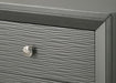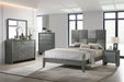 This bedroom collection is the embodiment of sleek, contemporary design, characterized by its rich finish and distinctive textured front panels. The centerpiece, a chic bed with a statement headboard, features geometric paneling that adds depth and interest. Flanked by a matching nightstand and complemented by a spacious dresser with a minimalist mirror, the set offers both style and utility. The clean, linear hardware harmonizes with the set's modern aesthetic, providing a subtle metallic contrast.