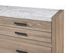 This bedroom collection brings a breath of fresh air to any interior with its light, natural wood finish that evokes a sense of calm and simplicity. The well-crafted bed frame, with its clean lines and subtle headboard design, provides a modern rustic charm that's both understated and inviting. Stylish night stands with integrated lighting backs flank the bed, creating a wall bed effect. Faux stone tops accent the storage pieces for extra luxury.