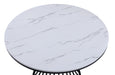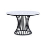 This dining set is a sophisticated blend of contemporary design and artistic flair, ideal for modern homes seeking a touch of elegance. The set features a sleek, round table with a faux marble top that is both beautiful and easy to care for. The table's base is a sculptural marvel, with a dynamic, cage-like structure that is as sturdy as it is stylish. Accompanying the table are plush chairs upholstered in a high-quality, textured fabric, their high backs and cushioned seats offering utmost comfort. The chairs' bold frames contrast with the light upholstery, adding a striking visual interest to the set.