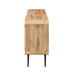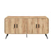 The Rowan 63" Sideboard doubles as a stylish TV stand with mid-century modern flair. Crafted from eco-friendly manufactured wood in a warm oak finish, it features rounded corners, black hardware, and tapered legs. Four cabinet doors conceal spacious shelves—perfect for storing media, electronics, or dining essentials. A versatile piece that works beautifully in living or dining spaces.