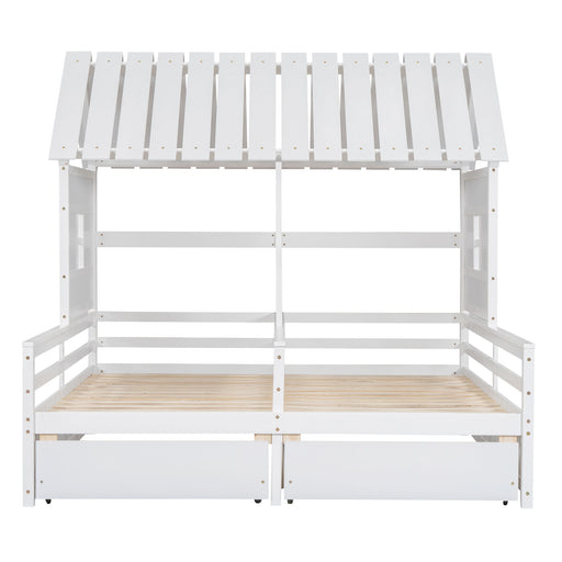 Twin Size Low Loft House Bed With Roof And 2 Front Windows - White