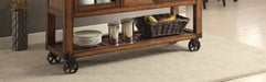 - Design and Features: This kitchen cart features a rectangular design with glass doors and two drawers equipped with side metal glide. It includes a bottom slatted shelf and oversized caster wheels with latching locks for easy mobility and stability.