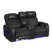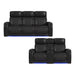 Upgrade your living room’s décor with the Prime Time P3 2PC Living Room Set. The power recline, headrest, and lumbar functions maximize comfort, elevating moments of repose. Features like LED lighting and the sofa’s drop-down table with reading lights add modern flair, while wireless charging, metal cupholders, and hidden storage in the armrests add practical convenience to both pieces. Luxurious 100% leather upholstery in a versatile black finish makes this set easy to pair with various décor styles and enhances durability. For a refined addition of style and comfort, the Prime Time P3 2PC Living Room Set delivers.