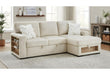 The U0222 Pull Out Sofa Bed by Global Furniture USA blends modern design with unmatched functionality. Upholstered in soft beige fabric and paired with two chevron-patterned accent pillows, it offers both style and comfort. This versatile piece features a pull-out sleeper, storage chaise with hidden lift table, two collapsible stools, and built-in bookshelf arms with a warm natural wood finish. Additional highlights include Bluetooth speakers, a drop-down table with cupholders, USB port, and overstuffed cushions for luxurious comfort. With its thoughtful design and upscale details, the U0222 is the perfect centerpiece for multifunctional living.
