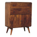 - Cabinet Curved Nordic Charm Artisan Furniture - Crafted from 100% Solid Mango Wood, this storage cabinet combines functionality with mid-century modern aesthetics. The warm Chestnut finish highlights the natural grain of the wood, adding timeless appeal. Featuring two compact drawers and a dual-door cabinet with two slots, it provides versatile storage for your essentials. Its clean lines, curved edges, brass knobs, and Nordic-style legs enhance its minimalist charm, making it perfect for bedrooms, living rooms, or home offices. This piece offers a stylish and durable solution for organizing your space with understated elegance.