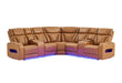The U8611 Power Sectional with Speaker by Global Furniture USA offers modern design, luxurious comfort, and smart technology in one statement-making piece. Upholstered in rich Camel PU with distinctive diamond-pattern stitching, this sectional features two console loveseats, each with storage and cupholders, plus a built-in speaker system for an elevated entertainment experience. Designed for both style and convenience, the sectional includes dual power reclining and power headrests, hidden arm storage, and side pockets with integrated LED lighting, while LED base lighting adds a sleek, ambient glow. Convenient USB ports on the power switches keep devices charged, and plush cushioning ensures superior comfort. With its upscale design, warm finish, and advanced features, the U8611 Camel PU Sectional with Speaker transforms your living space into the ultimate retreat.