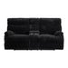 Let the Admiral Motion Loveseat with Console in Masis Black cradle you in unprecedented comfort. Upholstered in a plush, ribbed fabric and filled with supportive cushioning, this piece is made to enrich even your longest moments of repose. Manual reclining functionality enhances relaxation, while padded pillow top armrests are ideal for lounging. The center storage console allows you to keep your essentials comfortably within reach, perfectly complimenting the two metal cupholders. For a piece as versatile as it is comfortable, outfit your living space with the Admiral Motion Loveseat in Masis Black.
