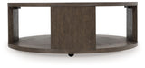 Elevate the everyday with this round coffee table. Its rich medium brown finish brings added flexibility, complementing a variety of casual contemporary color schemes. An open shelf encourages you to dress it up with decorative details, while casters provide easy mobility. Adding chic sofa-side form and function, this table lends an approachably luxe vibe to your space.