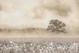 A tranquil cotton field unfolds beneath a misty sky, with delicate texture and calming neutral tones perfect for serene spaces.
