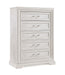 Introducing a bedroom collection that brings a breath of fresh sophistication to any living space. This suite boasts a bright, antique white finish that immediately brightens and opens up a room, providing a versatile foundation for any decor style. The bed's commanding headboard stands as a stately centerpiece, with architectural paneling details that convey a sense of sturdy elegance. Storage needs are gracefully met by the dresser and chest, each accented with refined drawer pulls that offer a subtle contrast and easy access.