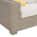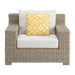 The Ollie Chair patio furniture piece just made your backyard experience a little more inviting. Crafted with a powder coated frame, this outdoor chair promises countless years of cherished memories with its unique half round weave design. You'll find upholstered cushions and pillow for you to kick back, relax, and gather around for some fresh air. Track arms and straight lines throughout make this Ollie Chair a transitional piece that will seamlessly blend in with the great outdoors.
